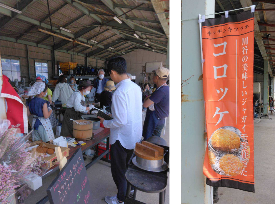 【鈴木】友達がよく泊まりに来るんですけど、みんなぐっすり眠りますね。星も月もきれいだよね。それから川谷マルシェっていうのが始まって2025年で3年目になるんですけど、ずいぶん人が集まってきてますよね。5月から11月までなんですけど、月に一回、原則第1日曜日に。場所は川谷小中学校の前です。私たち、コロッケ組っていうのを作って(笑)。川谷ってじゃがいもがとってもおいしいとこなので、じゃがいもをPRするっていう意味でも、マルシェでコロッケ販売をしてるんです。おかげさまでいつも売り切れなんです。お二人にも手伝ってもらってコロッケ作るんですよ。